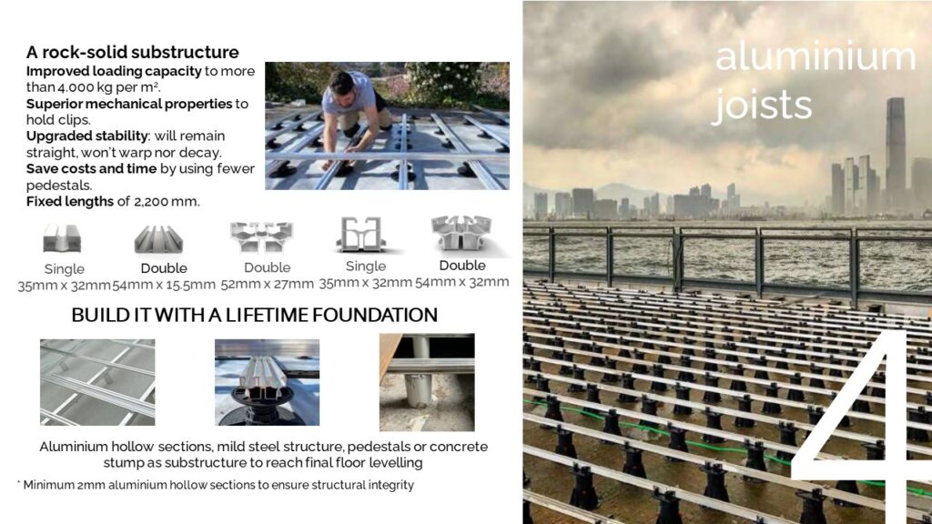 Choosing the right substructure is choosing the right foundation. You would not build your own home in a mud foundation, right? Then please do not choose soft wood or plastic joists to build your deck. Aluminum is the best choice and you would love working with it.